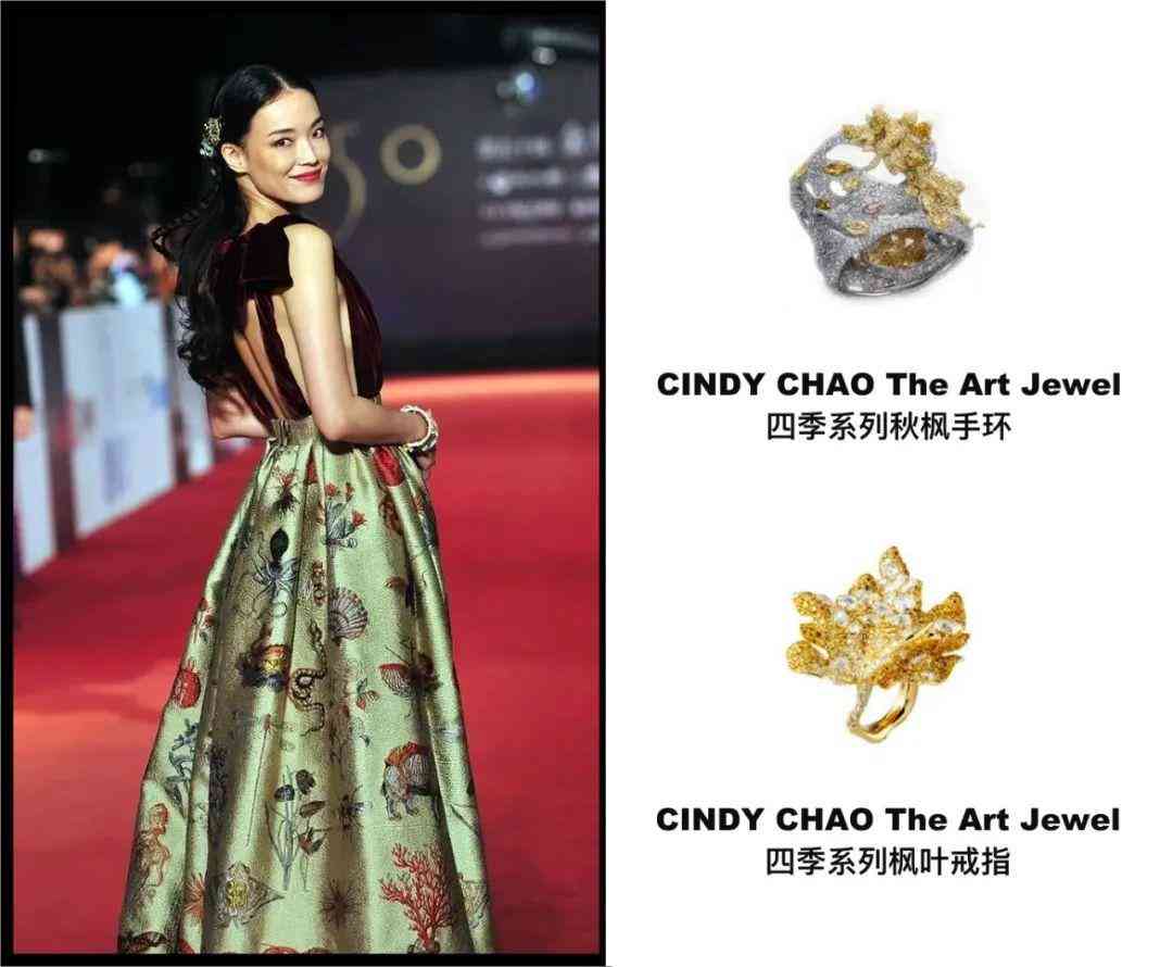 而当初舒淇艳压金马、成为RCFA年度“全球最美红毯top20”那套深V大露背礼服装,搭配的也是CINDY CHAO秋枫手环及戒指。