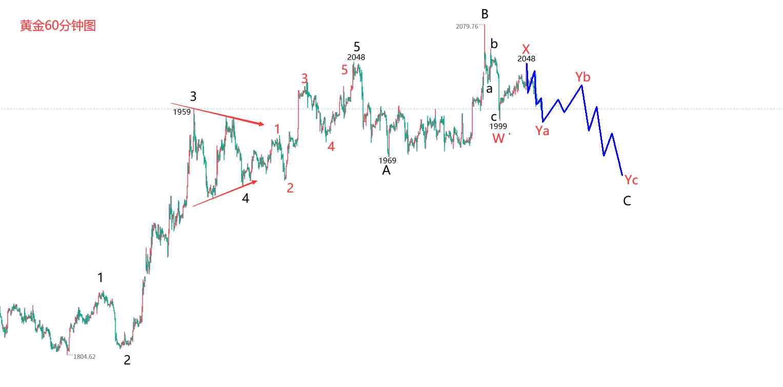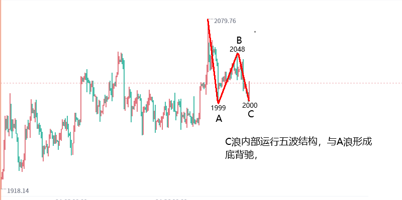 1小时图中,如下图,这是我们早上的推演图,预测2079-1999对应2048向下2000附近形成底背驰,也就是图中标记的W浪与Y-a浪背驰,一波下跌了80美元,一波到2000才48美元,根据波浪等长规则显然是不够,且Y-a内部结构运行出5波,显然价格下跌还没有到位,虽然时间到了,但波幅不够,因此价格下跌触及2000调仓做多,开启低多看Y-b反弹的思路。后市Y-b结束再空回来。
