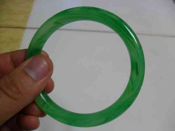这类料石即绿色玻璃、烧料或瓷等,也是一种常见的翡翠赝品。料石颜色虽绿却死板呆滞,虽透明却少晶莹,颜色形状不自然,为搅拌状、均匀状或点状;断口为亮碴贝壳状,且内部常有明显气泡,比重也较轻。