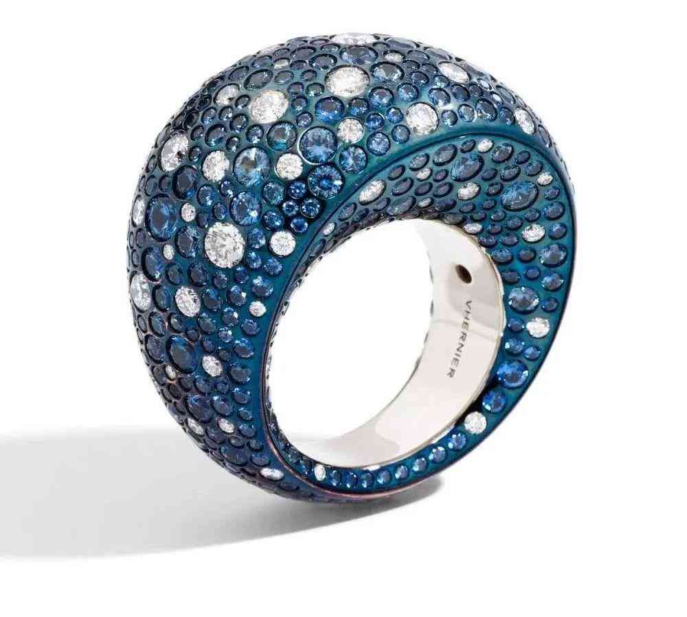 意大利珠宝商 Vhernier 在今年推出的全新珠宝中,特别采用的“Pavé Eyeliner”密镶工艺相当惊艳。和传统的密镶相比,全新研发的工艺镶爪更细,几乎隐秘在圆形金属框内,钻石和宝石的上平面和金属表面保持几乎一样的高度,极具视觉冲击力。