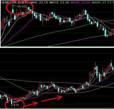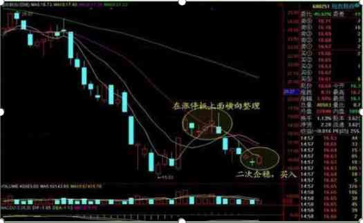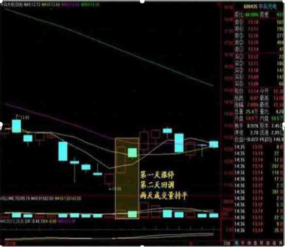 涨停之后,第二天略高开2%-3%,受大盘影响长阴回落至前一天涨停实体长阳中部,伴随的成交量保持在5%以下,前后两天基本持平。暗里是要上涨,却是故意回撤。接下来通常有两种走势:一种是回靠5日线后收十字星,然后开始反攻;另一种是开盘略微下探,然后直接以阳线吞吃前天的阴线,创出新高。