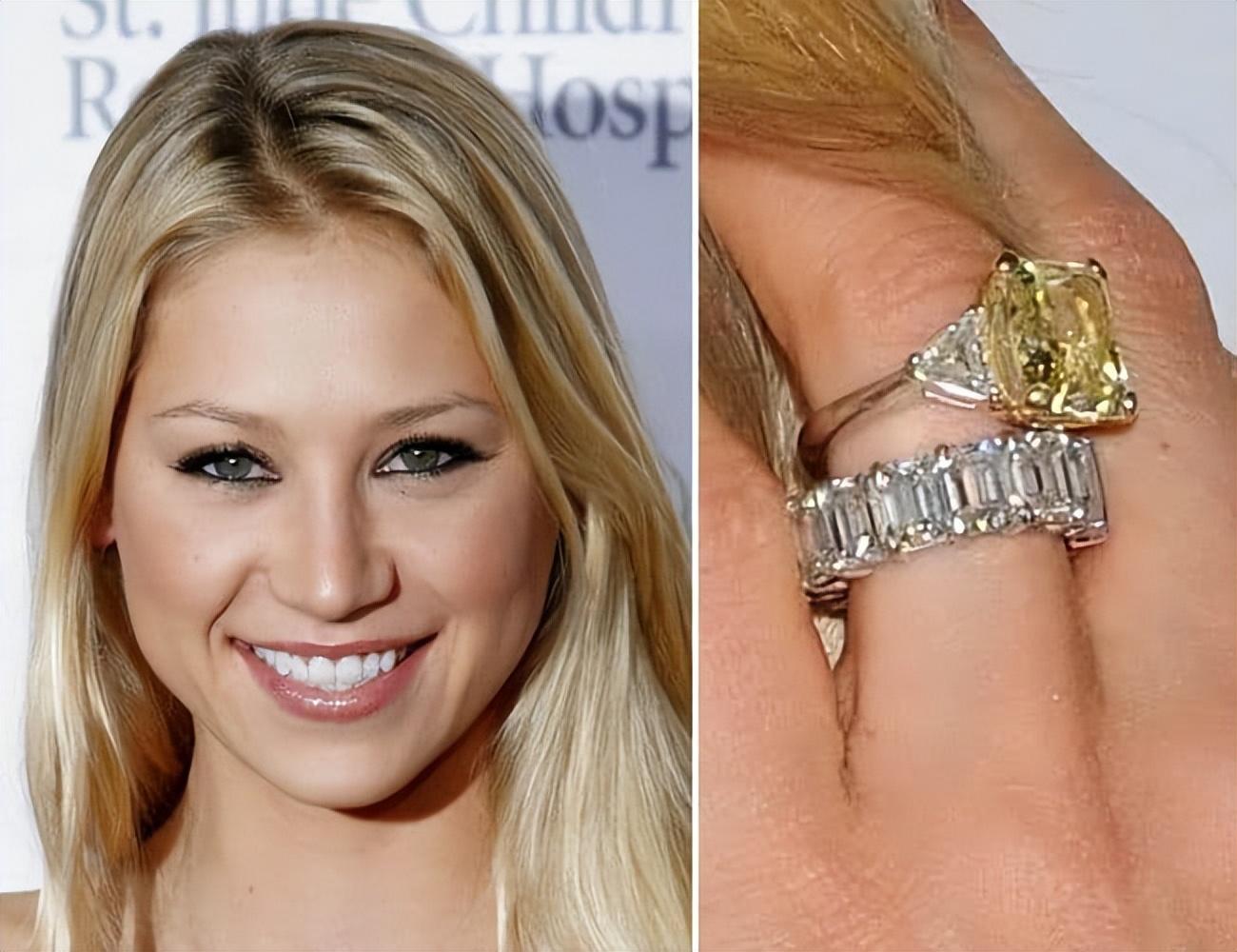 安娜·库尔尼科娃从拉丁音乐巨星恩里克·伊格莱西亚斯那里得到了最昂贵的订婚戒指之一。传闻她得到了两枚戒指,一枚是黄色的,另一枚是梨形粉色的。她次被发现是在2009年左右戴着它,专家估计,库尔尼科娃的金丝雀黄钻戒价值约550万美元。它目前的价格已经超过700万美元。