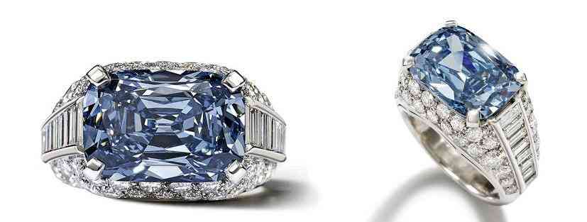 紧随其后的是宝格丽蓝钻订婚戒指,该戒指于2014年在拍卖会上以949万美元的价格售出。这枚令人惊艳的戒指饰有一颗重5.30克拉的枕形深蓝色花式主钻。戒指的戒环饰有密镶圆形明亮式和长方形切割白钻。宝格丽蓝钻订婚戒指的高价是由于大颗蓝钻,这是世界上最稀有的钻石之一。宝格丽蓝钻订婚戒指于1965年制作,采用珠宝商标志性的长号风格进行镶嵌。