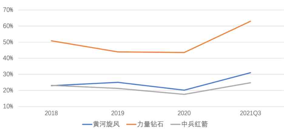 据力量钻石2021年三季报显示,其毛利率由上年同期的40.32%增长至63.05%,同期的中兵红箭、黄河旋风毛利率仅为24.79%、31.02%。