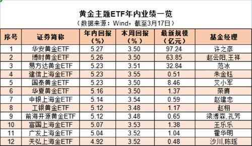 黄金主题ETF方面,wind数据显示,截至3月17日,黄金主题ETF年内平均涨幅5.15%。其中,3月13日至3月17日期间涨幅明显,平均涨幅达3.51%。