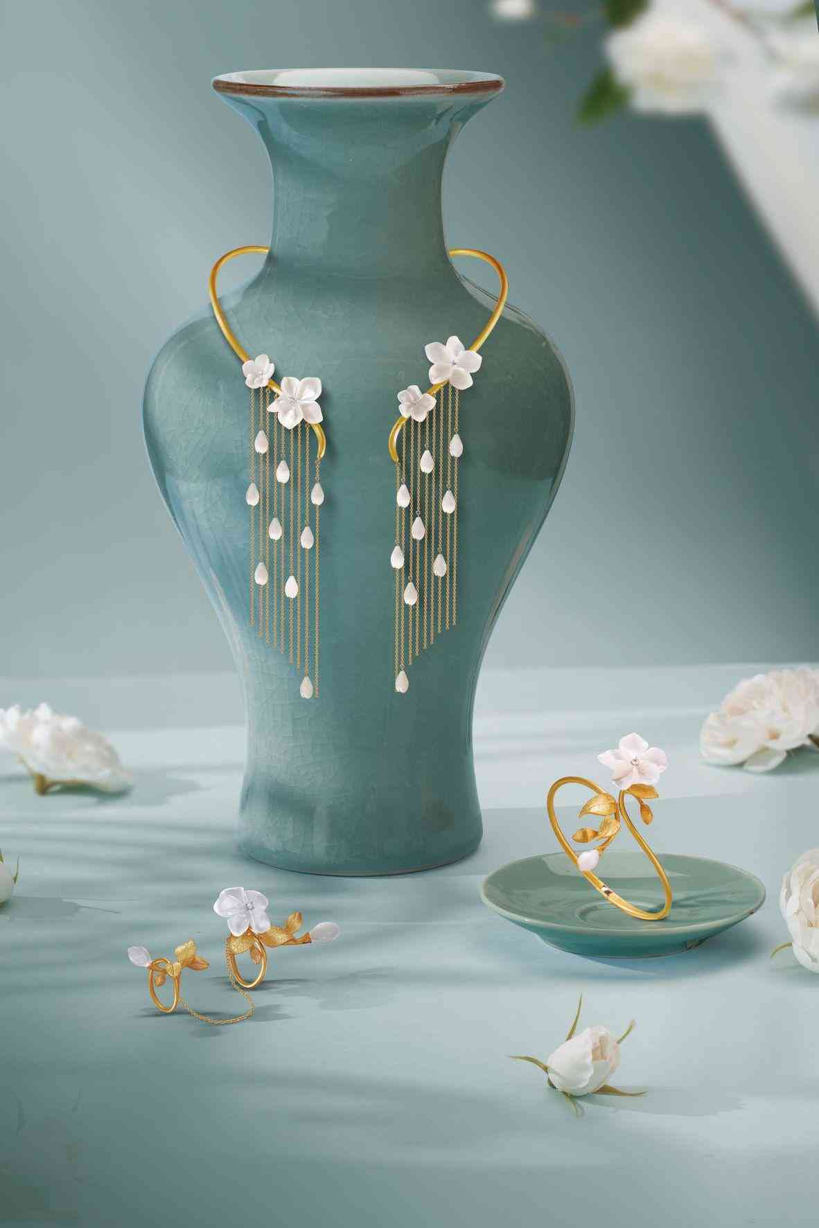 值得注意的是,为了打破消费者对传统婚嫁金饰的印象,老庙黄金这次借鉴了外部设计力量,跨界请到2位本土服装设计师陈野槐和李鸿雁,以及珠宝设计师龙梓嘉分别进行创作。根据老庙黄金的介绍,这三位设计师在创作的过程中,在古法金工艺基础之上,融合珍珠、母贝、玛瑙等材质混搭设计。