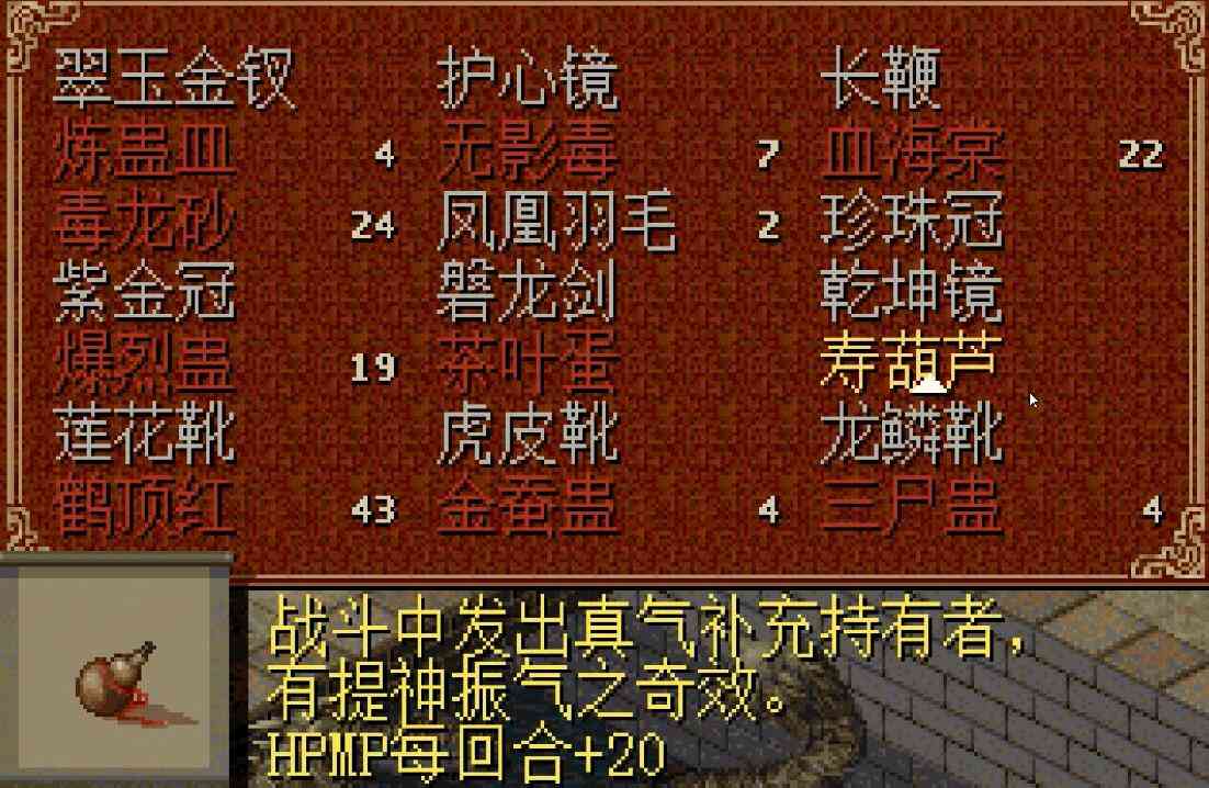 而要是佩戴了寿葫芦的话,在战局完成之后会额外增加20点MP,就依靠这个MP就能直接选用“酒神咒”,然后让其他人给李逍遥喂天仙玉露。