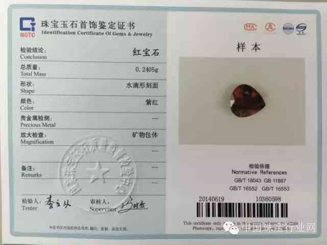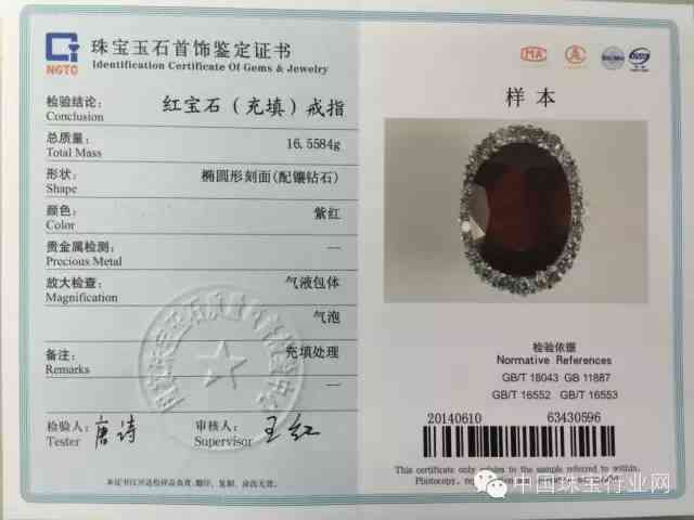 买红宝石,认准证书是关键。目前,权威机构国家珠宝玉石质量监督检验中心(NGTC)依据国家标准GB/T 16552《珠宝玉石名称》、GB/T 16553《珠宝玉石鉴定》,对一百余种包括天然宝石、天然玉石、天然有机宝石及各种人工宝石在内的珠宝玉石检测并出具“珠宝玉石首饰鉴定证书”,其中就包括红宝石及红宝石镶嵌产品鉴定证书。