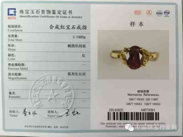 检验结论:确定红宝石的种类,同时标明宝石是否经过处理。若是天然红宝石,则检验结论一栏只显示“红宝石”;若是宝石为合成或者经过了处理,则在检验结论中写明“合成红宝石”或者“红宝石(具体处理方法)”等。