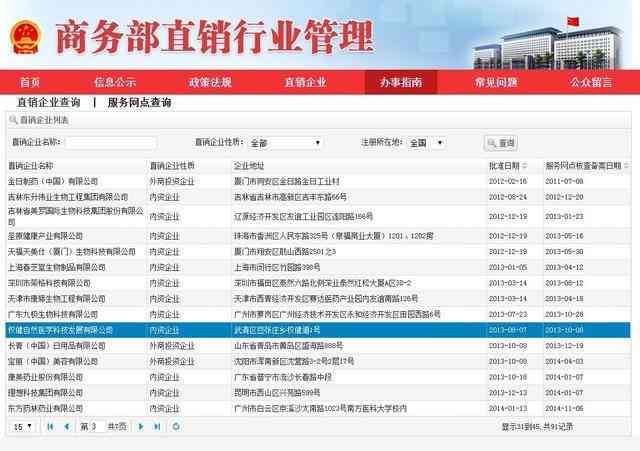 商务部直销行业管理网站显示,我国批准注册的直销企业有91条记录,其中雅芳(中国)有限公司是最早获批的企业,于2006年2月22日获得批准。而最近一个获得批准的是汉德森日用保健品(上海)有限公司,时间是2018年1月19日。早期获批的主要为外商投资企业,从2007年开始,内资企业开始大量出现。权健自然医学科技发展有限公司于2013年8月7日获批,目前仍然在直销企业目录中。
