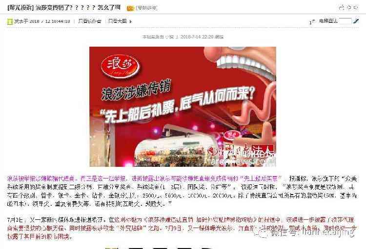 在义乌当地人气颇旺的稠州论坛上,有一个帖子根据媒体报道,质疑浪莎的直销是变相传销。质疑浪莎旗下的“众美系统采用的奖金制度提到三级分销、直推分享奖金、系统奖金(1—8层)、团队奖、分红等”。不仅是“先上船后买票”,而且是涉嫌直销变传销。