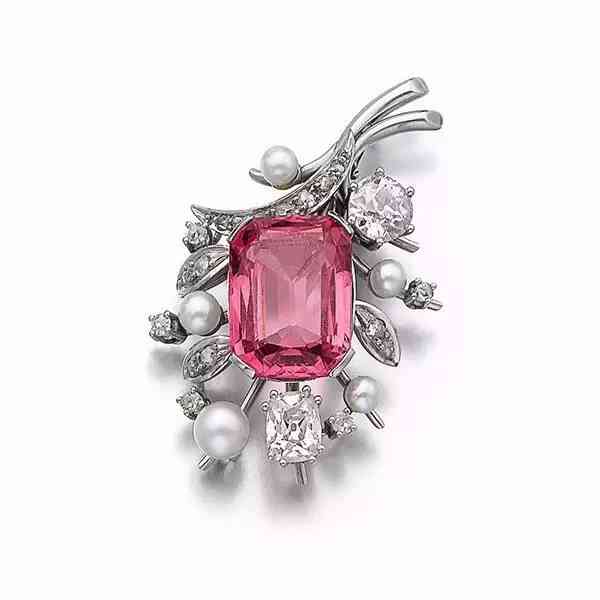 其它彩色宝石方面,表现最抢眼的是红碧玺。宝格丽(Bulgari)出品的一对红碧玺耳环和一个粉红色碧玺吊坠,都以超出最高估价的三倍成交。这种对红色的追捧,连带着也影响到了尖晶石的价格。一枚5.63克拉的红色尖晶石戒指和Karl Rothmüller出品的粉红色尖晶石胸针,都以超出最高估价的两倍成交。