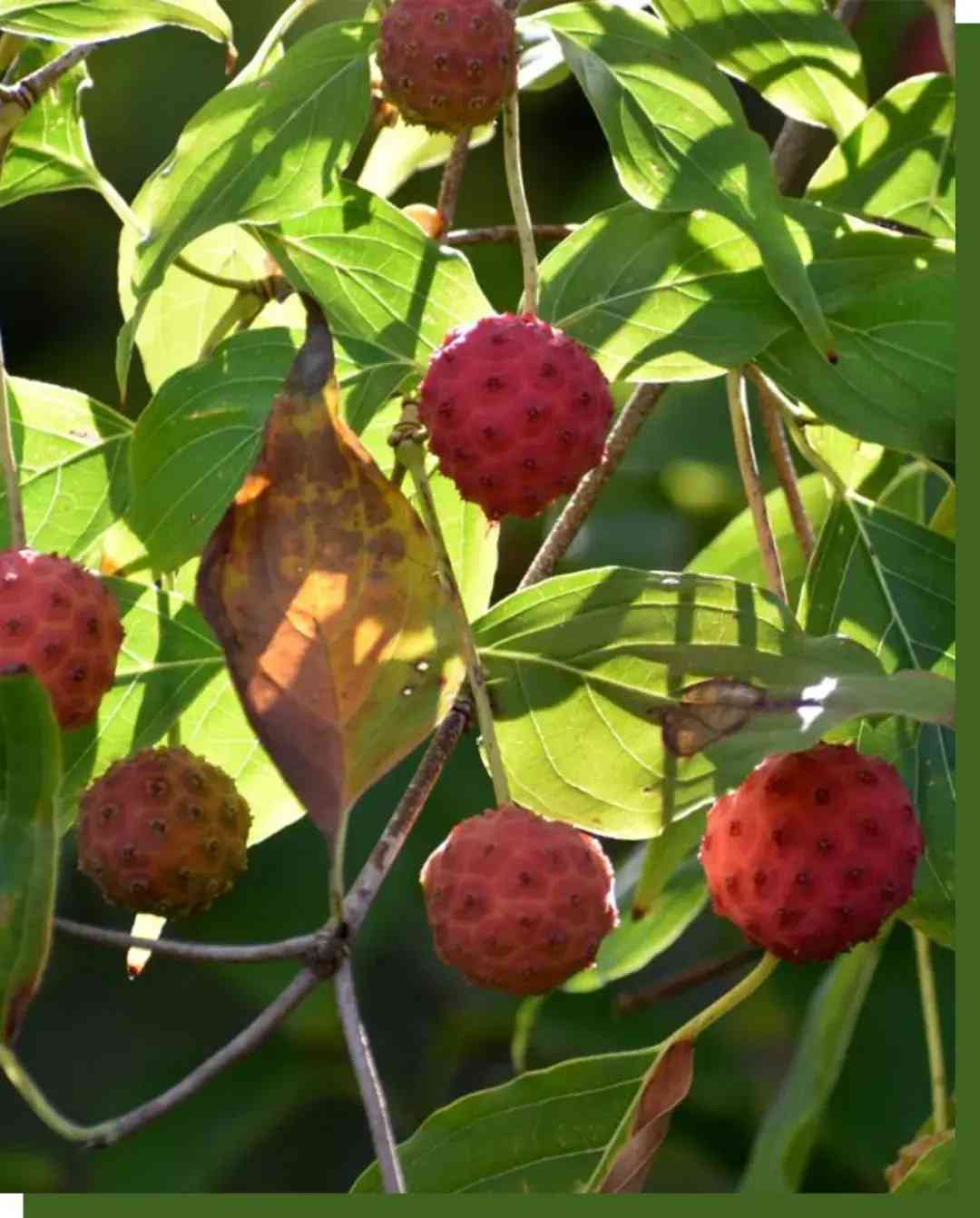此时正是四照花开得漫山遍野的时候,9 ~ 10 月鸡嗦子成熟。别名石枣、羊梅、山荔枝、癞头果。© sinovision.net
