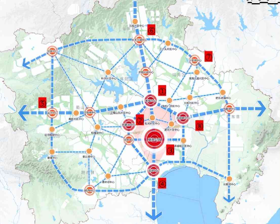 ① 合肥老城也就是合肥一二环; ② 天鹅湖、政务区、现在合肥的王冠;③ 骆岗中央公园 未来整个大合肥的中心,现在全是空白; ④ 滨湖新区、省府; ⑤ 高新区最西、运河新城; ⑥ 北部中心; ⑦ 少荃湖; ⑧ 东部新中心; 合肥的问题是以前的老合肥城市框架太小,而现在的新合肥城市框架又过大。