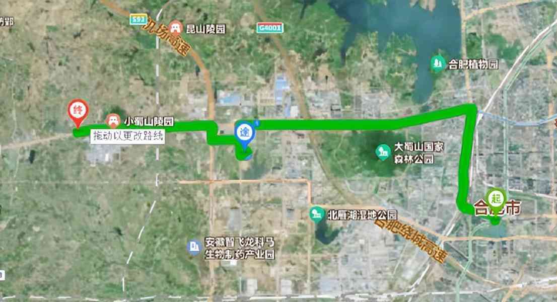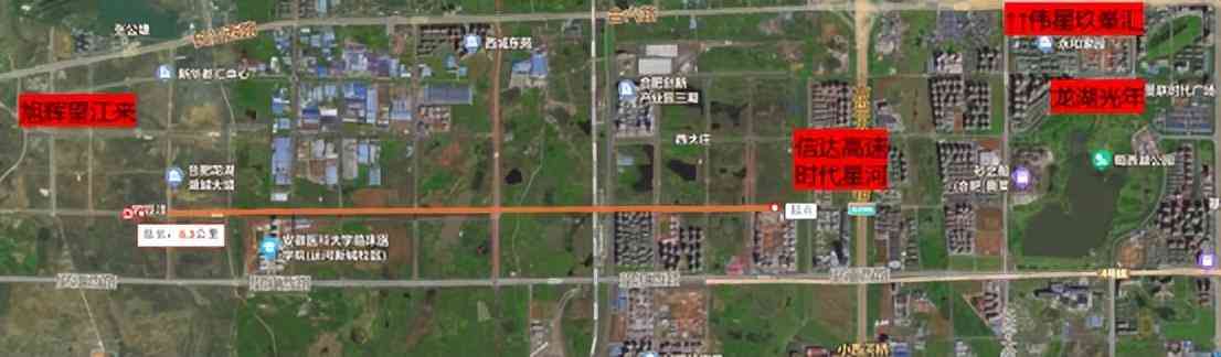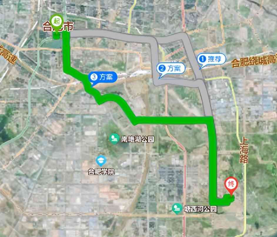上图123三个数字连接线是合肥的绕城高速,起点政务区天鹅湖到终点滨湖新区最南端省府差不多近20公里。
