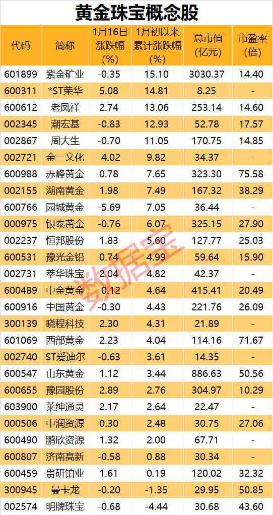 证券时报·数据宝统计显示,A股中布局黄金珠宝的概念股共有27只,1月16日共15股上涨,*ST荣华涨停,豫园股份、老凤祥、晓程科技等6股涨幅居前,均超过2%。