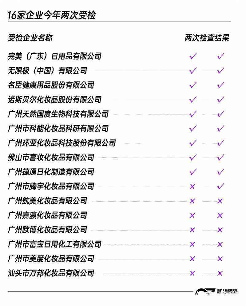 南都大数据研究院比对发现,在今年的不合格名单中,有21家企业去年也曾被查出问题。例如,广州嘉瀛化妆品有限公司去年曾被发现物料与产品方面存在危险品仓库管理不规范问题,今年两次受检也都没有过关。