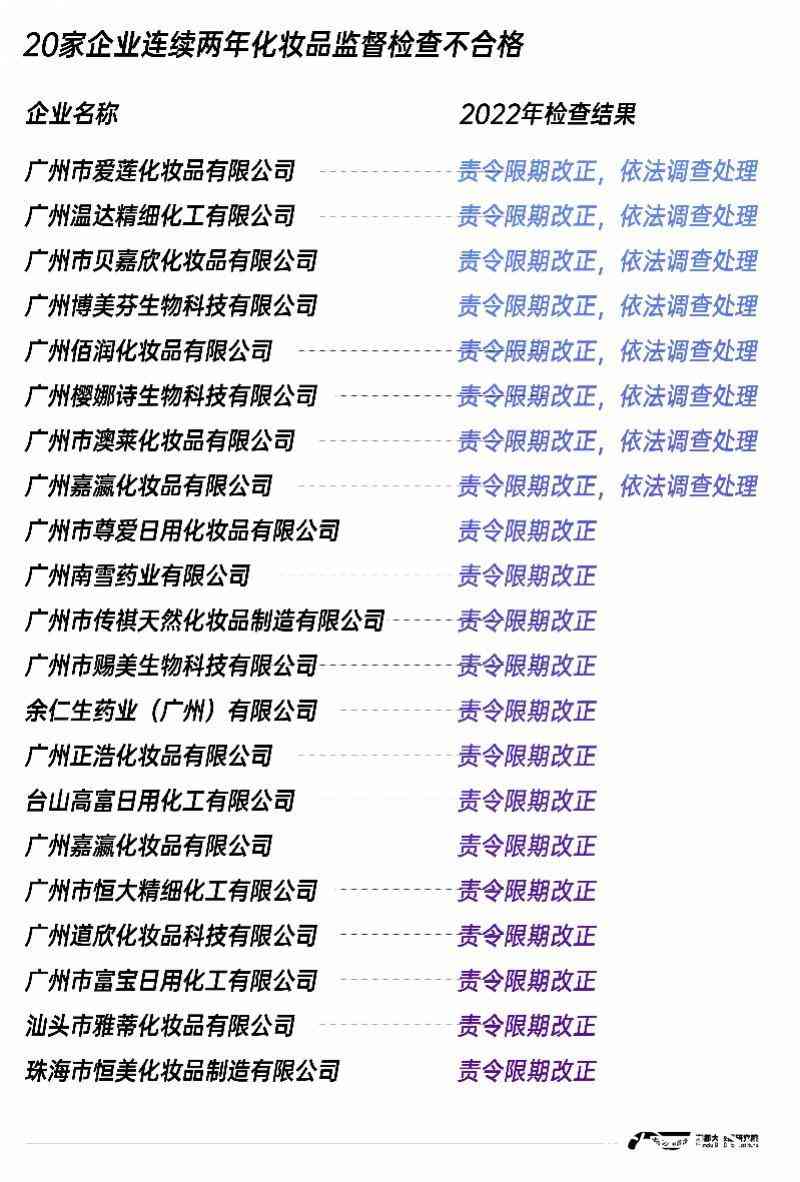 值得注意的是,广州温达精细化工有限公司、广州市富宝日用化工有限公司、广州市美度化妆品有限公司、广州市神彩化妆品有限公司、广州市韩妃化妆品有限公司等28家广州企业,在今年广州市的监督检查中同样被查出问题,部分企业被责令限期改正的同时,依法调查处理。