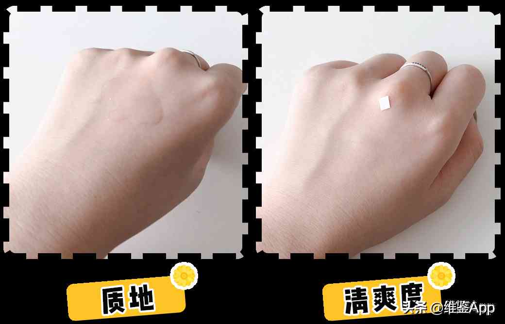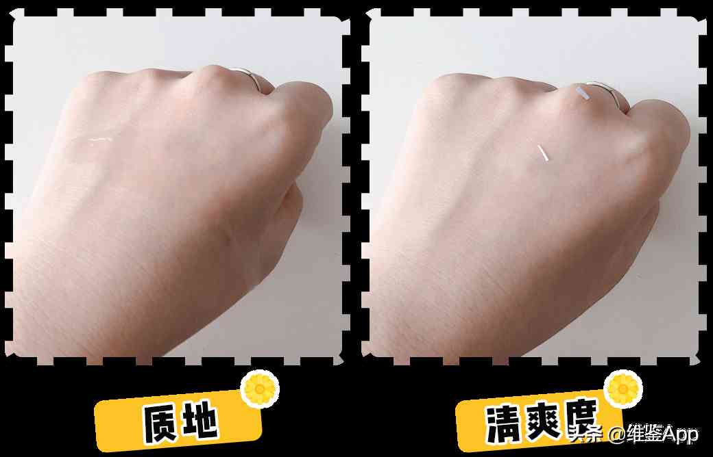 质地有点稠,介于精华和普通化妆水之间,推开后稍微有一丢丢黏,但等完全吸收黏腻感就会消失。