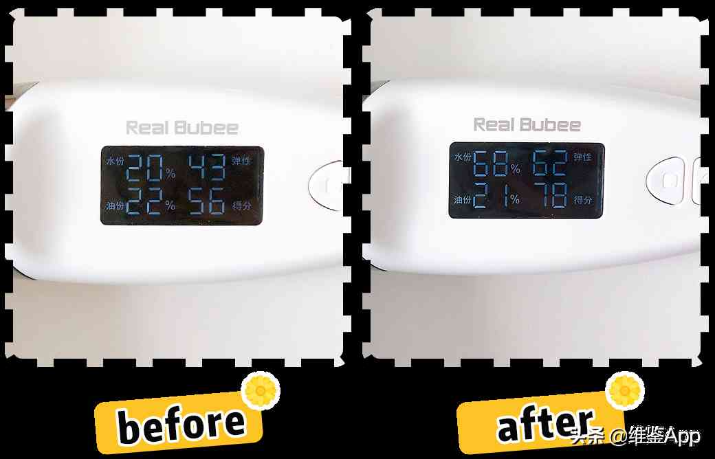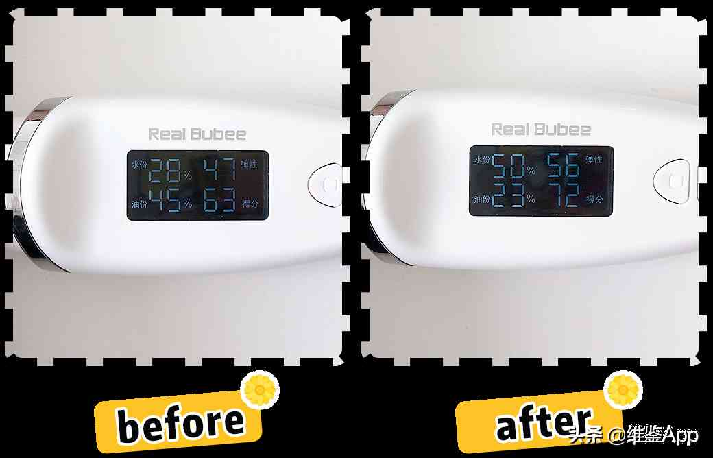 使用前的水油值分别为29%、44%,使用过后水分值提升至了57%,油分值下降为了22%,水油平衡能力不错~