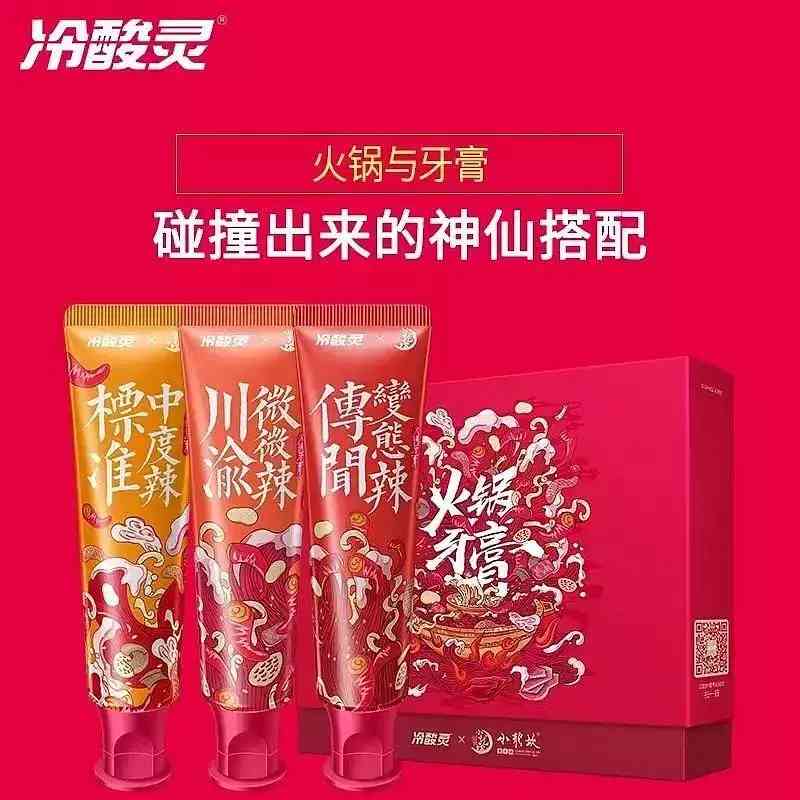 今年,牙膏界和火锅界的两大巨头推出了一款火锅味的牙膏,宣传语写的也是噱头十足,“前所未有的奇特口感,绝对刺激的刷牙体验,帮你唤醒体内的沉睡因子,这个夏天精神百倍。”这款由冷酸灵和小龙坎合作推出的牙膏甚至还分为三个等级的口味辣度,分别为微微辣、中度辣和变态辣。