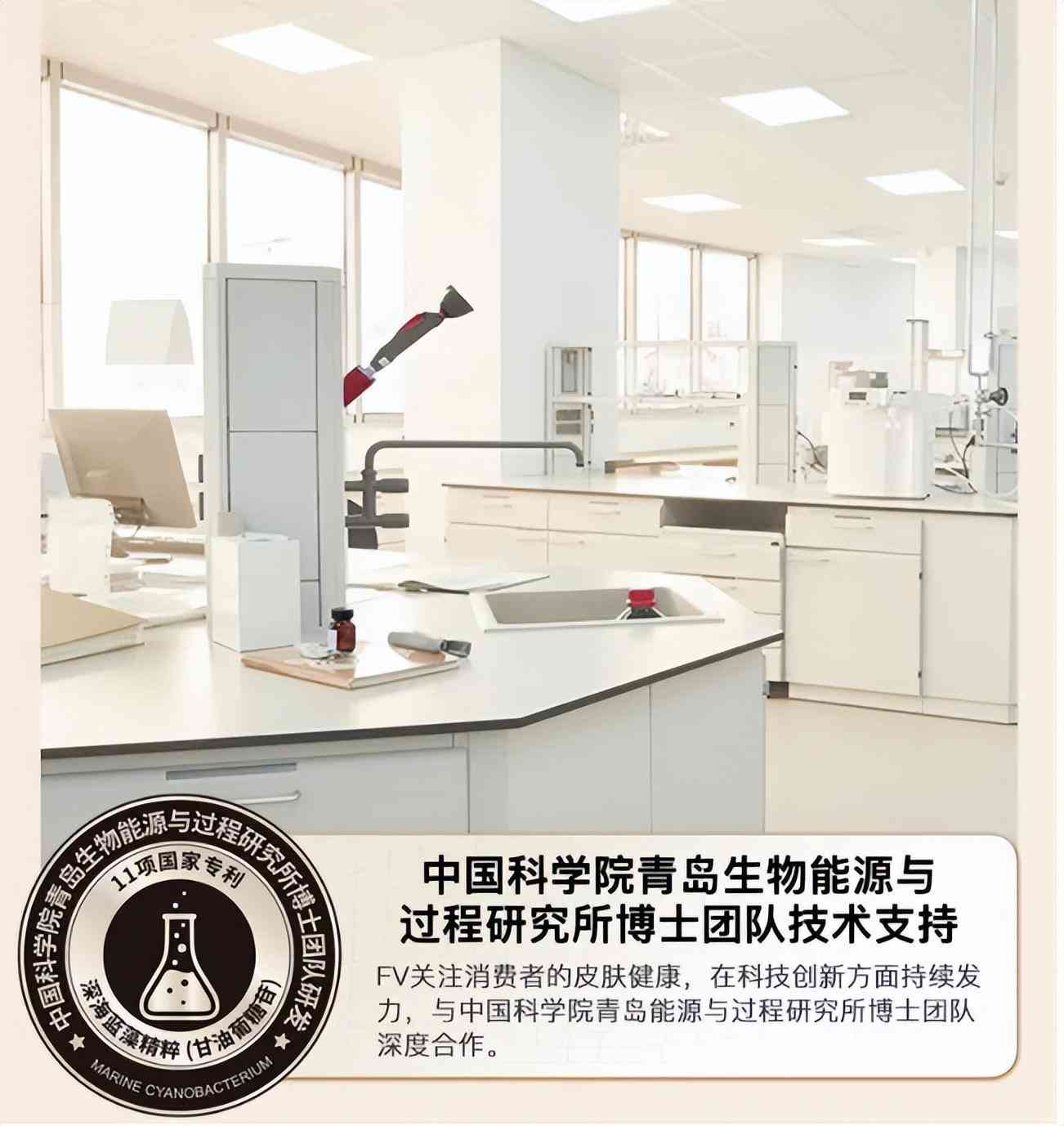 契合消费者痛点,FV深度合作中国科学院青岛生物能源与过程研究所博士团队,重磅引入“深海蓝藻精粹”,具有舒缓修护、滋润保湿等功效,呵护消费者肌肤健康。
