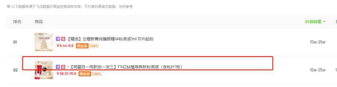 从果集·飞瓜数据统计的1月「热门商品榜」显示,在美妆个护-遮瑕类目中,品牌FV的“FV红钻植萃养肤粉底液”位列TOP2,1月销量区间在10w-25w,是当之无愧的爆品。