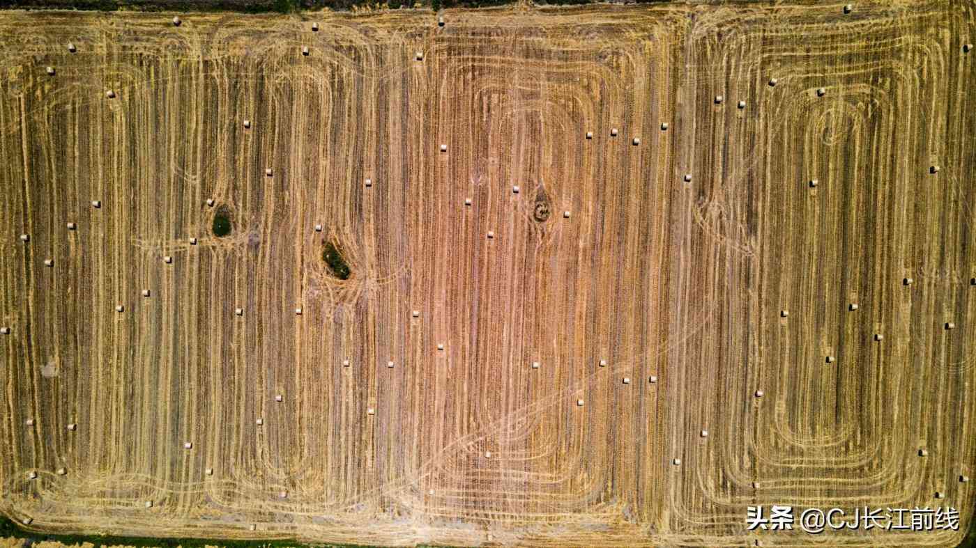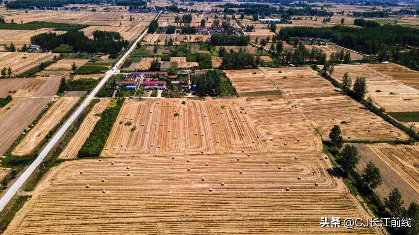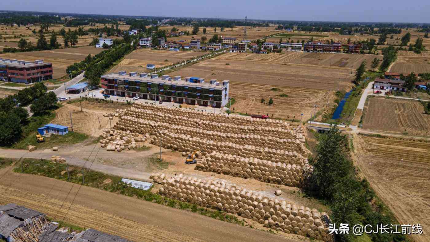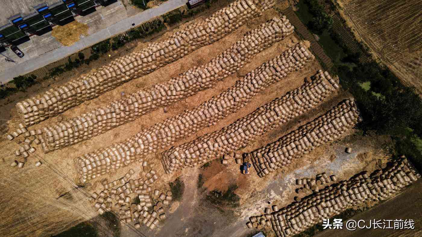 2021年6月6日,河南省淮滨县西部乡镇的麦田里,从空中看去,金黄色的圆圆的小麦秸秆捆散放有序,不远处的秸秆垛堆积如山,远远看去,很是壮观。