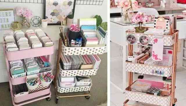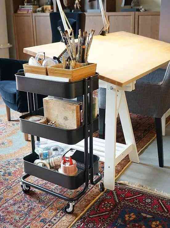 摆满书本的书房,还堆满了各种凌乱的办公小文具。移动手推车是拯救小文具收纳的神器,无论是喜欢手工还是喜欢画画的人,兴致或灵感来了的时候,小文具随手可及,不用再费事收拾。
