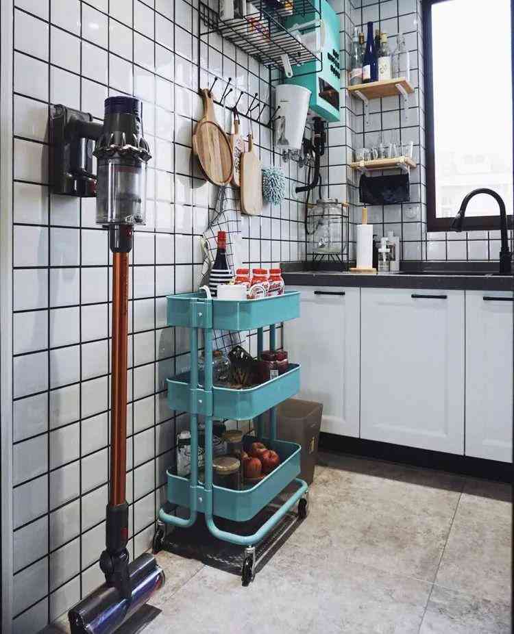 小户型厨房杂物众多,固定收纳的面积有限,把小推车作为额外收纳能够减轻厨房收纳的压力。