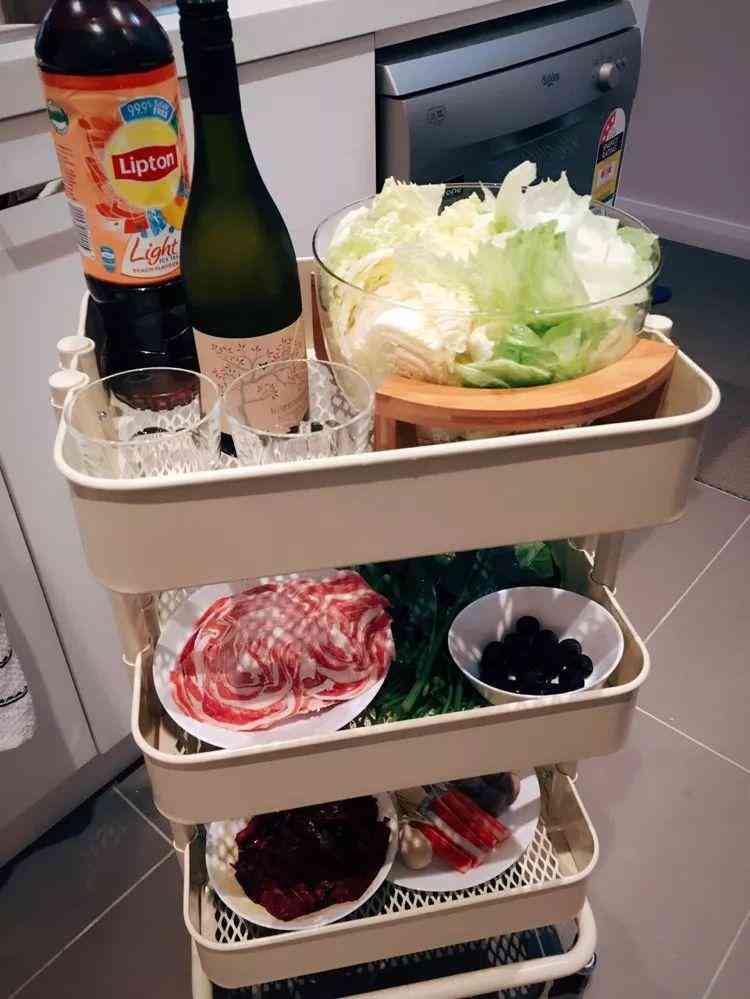 亲友聚会时餐桌杂物过多,提前把桌面的纸巾、水杯等全清走,放在移动的小推车里面,餐桌就有更多位置摆放食物,大家用餐时想用纸巾也不必离开位置,直接移动小推车就ok。