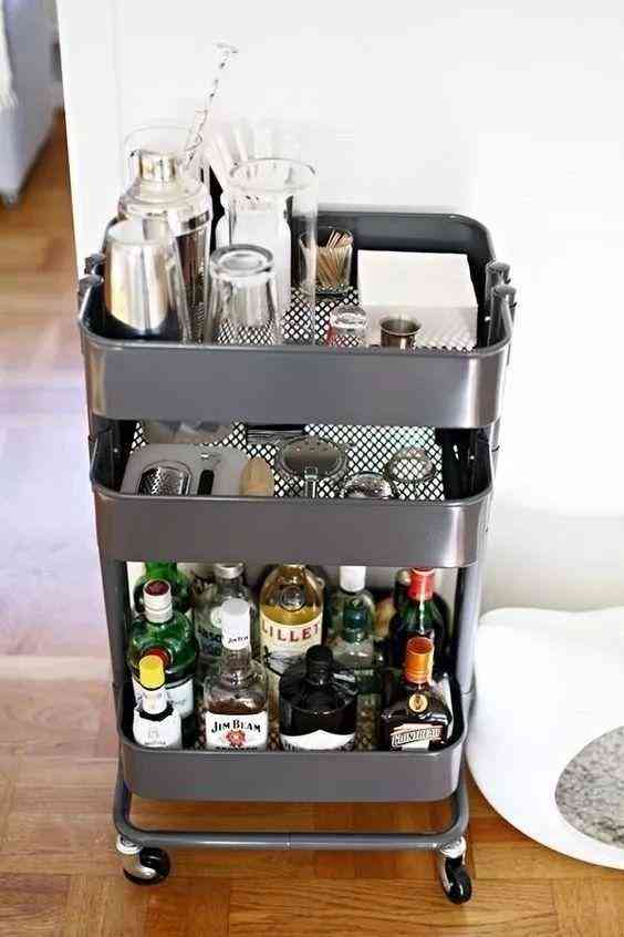 小居室没有空间装吧台,心中也有一个私人酒吧梦。用1m²小推车造作出一个小吧台,小家也有满分的格调生活。