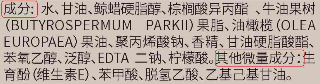 1)在销售包装可视面标注化妆品全部成分的原料标准中文名称,以“成分”作为引导语引出,并按照各成分在产品配方中含量的降序列出。配方中存在含量不超过0.1%(w/w)的成分的,所有不超过0.1%(w/w)的成分应当以“其他微量成分”作为引导语引出另行标注,可以不按照成分含量的降序列出。