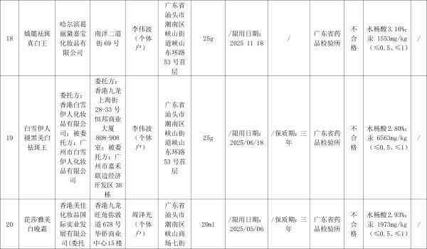 广东省药品监督管理局近日发布化妆品抽检通告:在抽检的941批次化妆品中,共检出不合格产品38批次,不合格率为4%,涉及奥齿健三七牙膏、白雪伊人褪黑美白祛斑王、芘莎雅美白晚霜等。