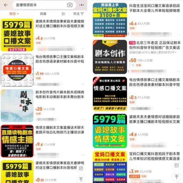一名卖家称,婆媳关系、夫妻关系、家庭生活等一些“苦情戏”剧本,在中老年受众中比较受欢迎。而记者在某电商平台搜索发现,这些剧本售价最低仅需几块钱。