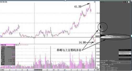 如图2-18所示,天士力(600535)的庄家底部建仓过程中,成交量在这个时候出现了持续放大。而对应的筹码,也在该股缩量上攻前聚集到了该股的下方。呈现出上方单峰聚集,而下方持续跟进的少量筹码,庄家的建仓与操盘过程已经完成了。在该股顺利突破的时候,必然会带来丰厚的利润。