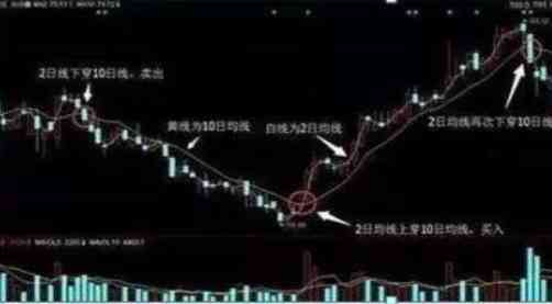操作其实很简单,大家先把多余的均线去掉,设定好2日线和10日线。如果2日均线上穿10日均线,我们可以大胆买入,相反,2日均线下穿10日均线,则可以果断卖出。(如下图)