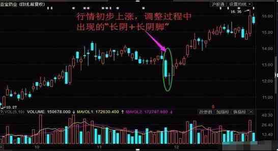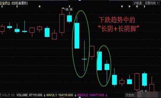3、 大阴+阴长脚,这两个交易日当中,如果成交量相对较小,那么后期股价上涨的概率就会更大。如果成交量相对较大,则后期股价上涨的概率没有前一种情况的概率大。(当然一般情况下,形成大阴线不太可能伴随很小的成交量)