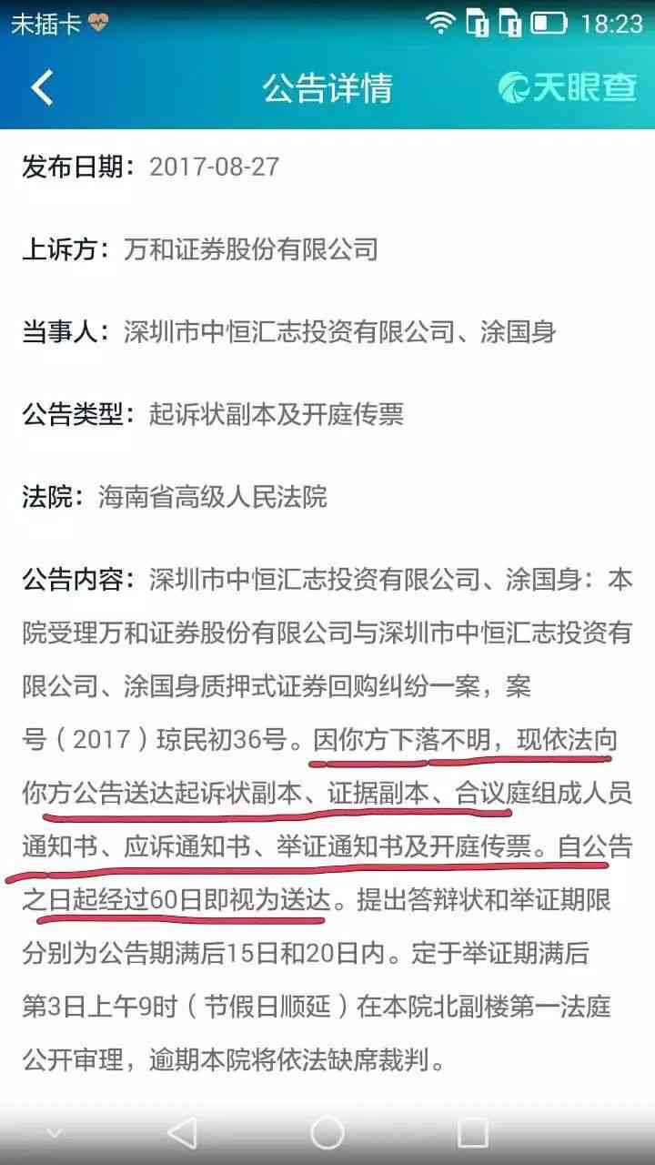 涂国身是否有资金、资产补仓,将存在很大疑问。根据天眼查资料,8月27日,海南省高院向中恒汇志、涂国身下达起诉状副本及传票,因万和证券上诉中恒汇志、涂国身证券质押回购纠纷一案,中恒汇志、涂国身“下落不明”,海南高院向其公告送达起诉状副本及传票。若在规定时间内为提交答辩状、举证,逾期法院将缺席裁判。