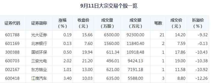 证券时报股市大数据新媒体“数据宝”统计,9月11日共有32只个股现身大宗交易平台,累计成交量1.29亿股,累计成交额17.22亿元。其中19只个股交易额超千万元。光大证券交易额最高,大宗交易共21笔,成交额9.23亿元;其次是北京银行,大宗交易共2笔,成交额1.18亿元。