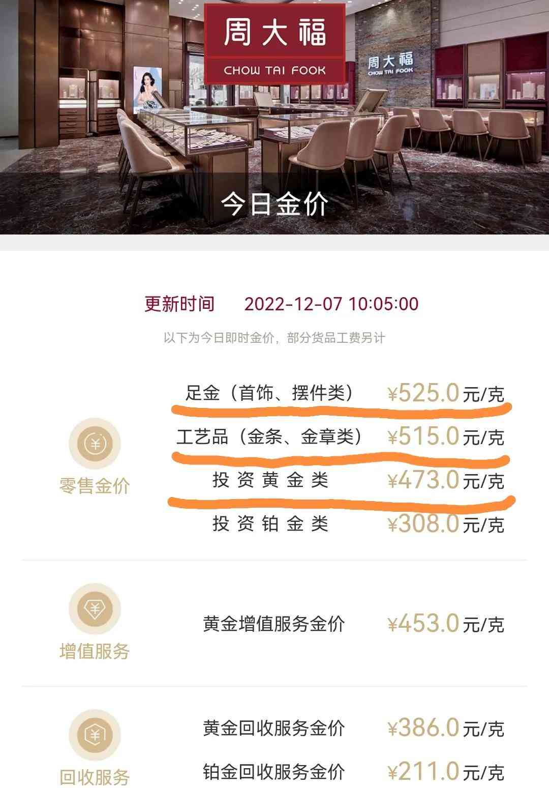 周大福、周生生、老凤祥、老庙黄金等金店投资金条约473元/克(上海黄金交易所金价+71元/克)。工艺金条约515元/克(上海黄金交易所金价+113元/克),可以搜索银行或金店官网查询价格。