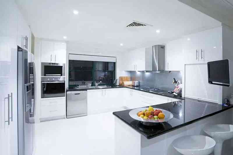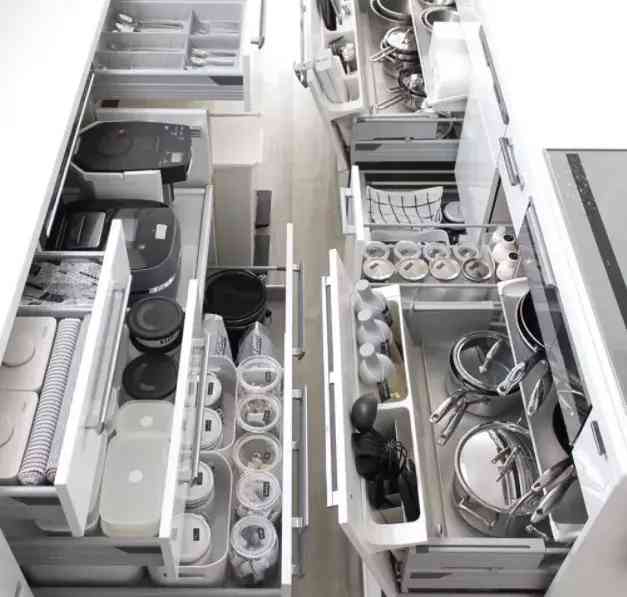 本身的柜体也可以设计收纳功能,设计多个抽屉或者大区域的收纳格,这样就能放置更多的厨房用品,使厨房保持整洁干净。