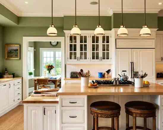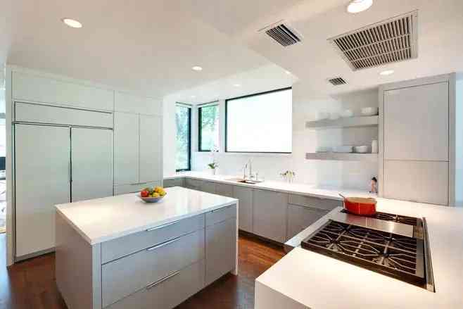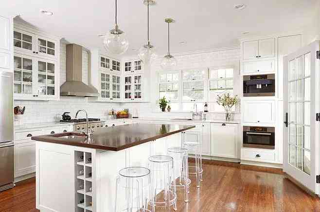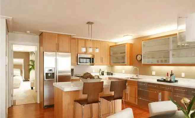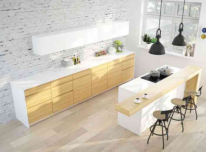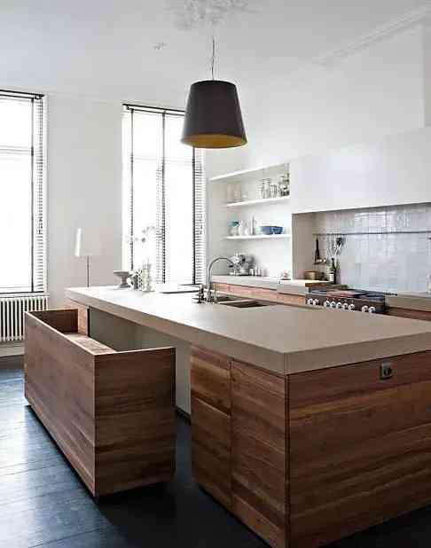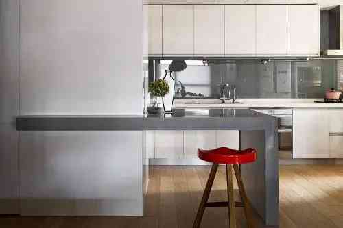 因为厨房的油烟多,所以选择中岛材质的时候要特别注意,要以稳定、好打理的材质为主。木头台面外观大方好看,但价格昂贵又不易清理,且在厨房这种高湿度的环境下,木头材质的台面大多数容易开裂,一旦开裂就会藏污纳垢,会大大加大清理难度。