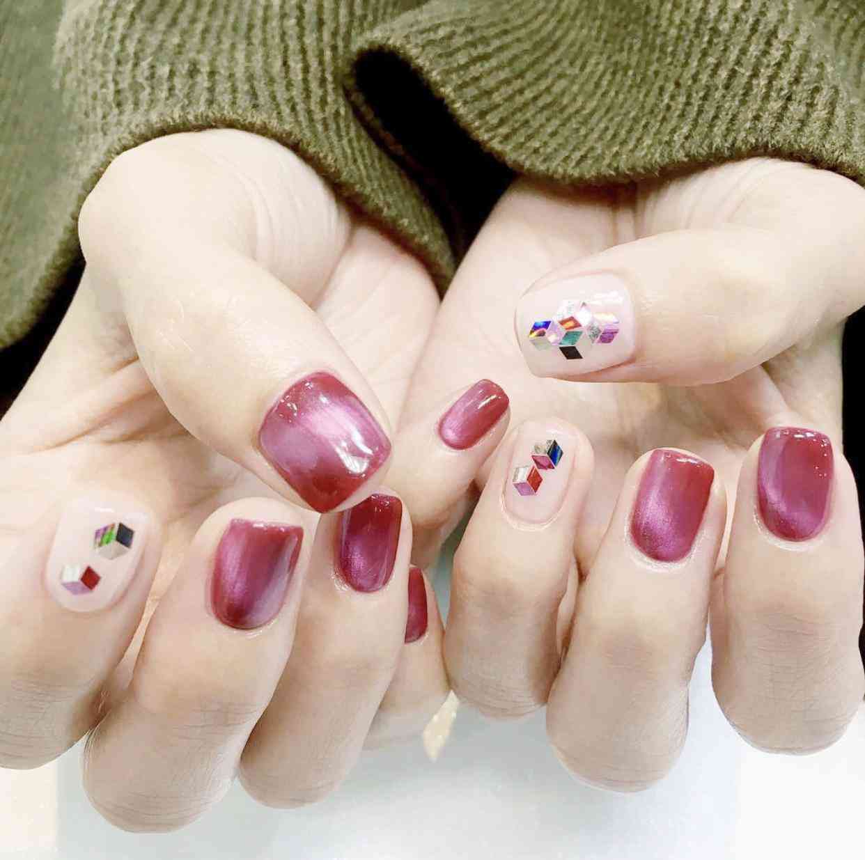 除了酒红色和正红色这样比较艳丽的颜色之外,一些淡雅一些的红色系猫眼甲,也有着不错的显白效果,看起来会更加温柔一些。