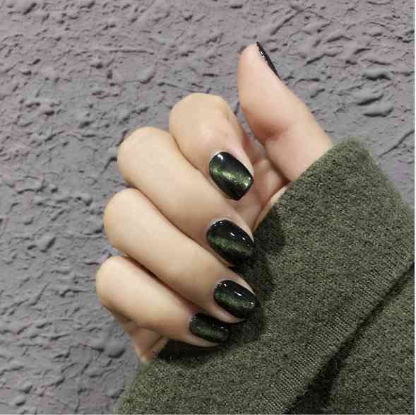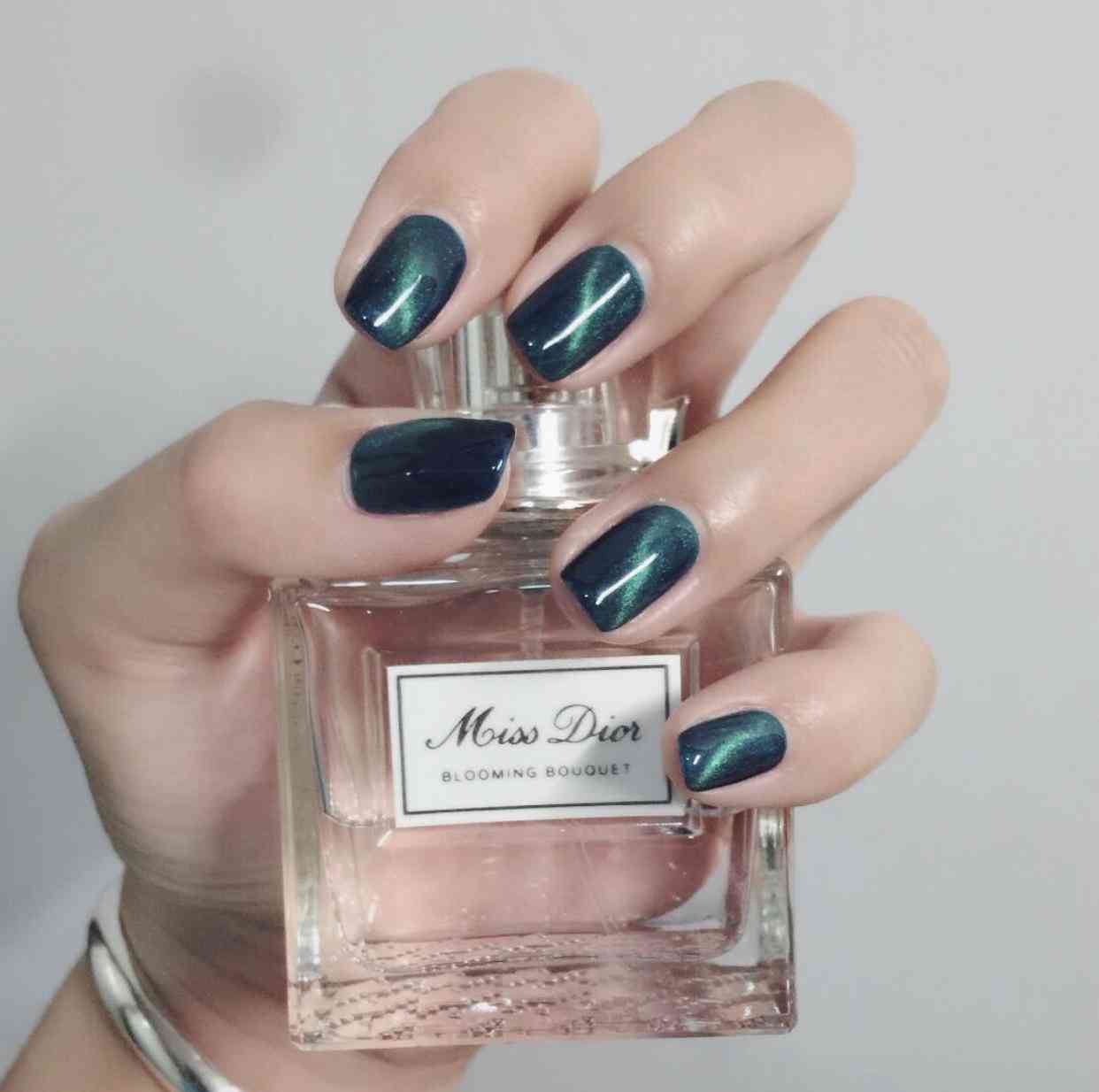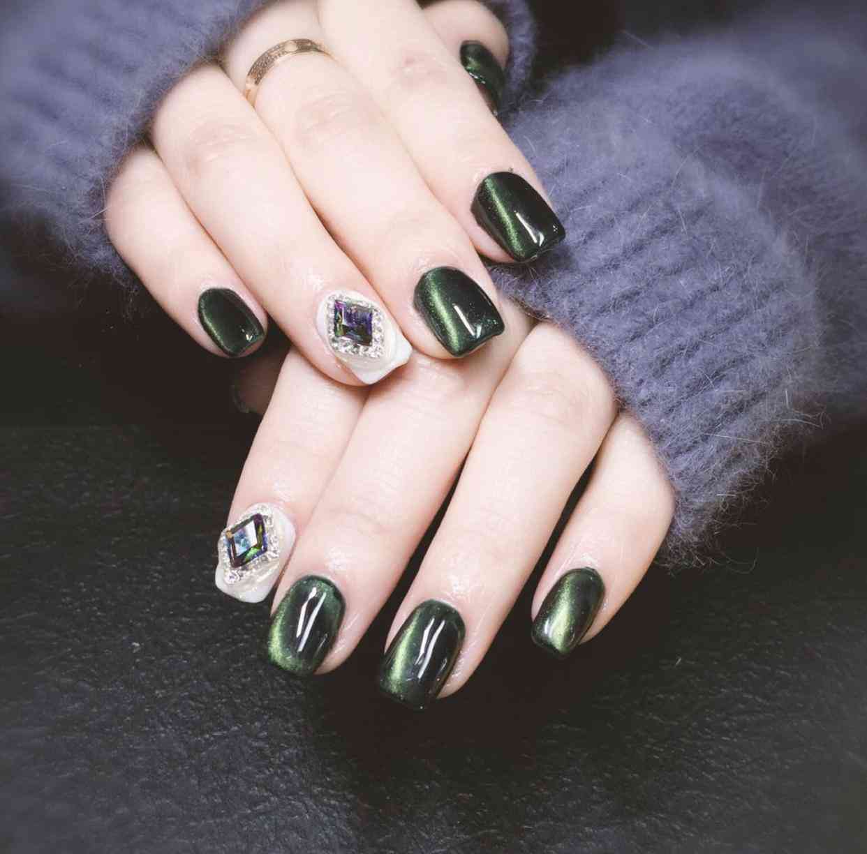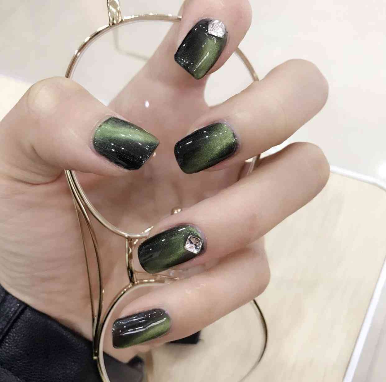 说到红色,和红色有着同样出色的显白效果的,就是绿色啦~绿色猫眼甲,有着非常高级的质感,也很好额还原了猫眼的质感,尤其是在黑色上书上绿光猫眼,这种深邃的神秘感,会让指尖显得格外独特,同时又很有时尚感。