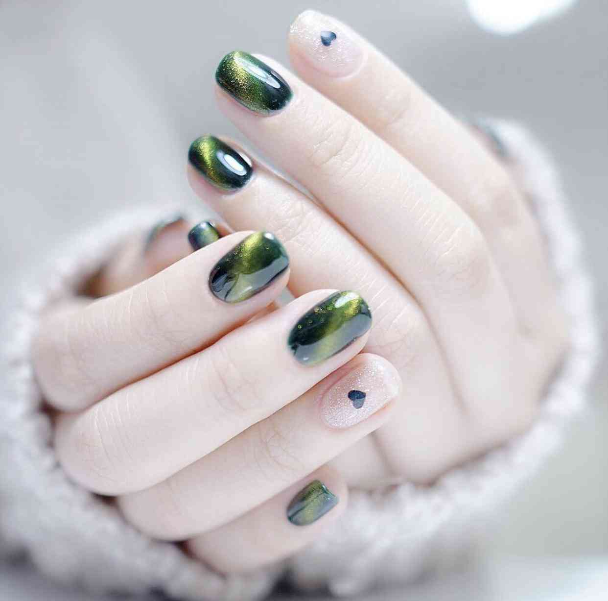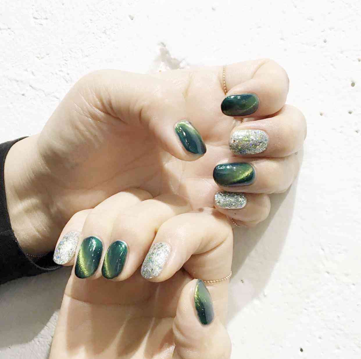 用绿色的猫眼胶,搭配亮片美甲,会有更加闪亮的效果,这种不同质感的光泽,会让指尖更有层次感,也让整款美甲变得更加耐看。