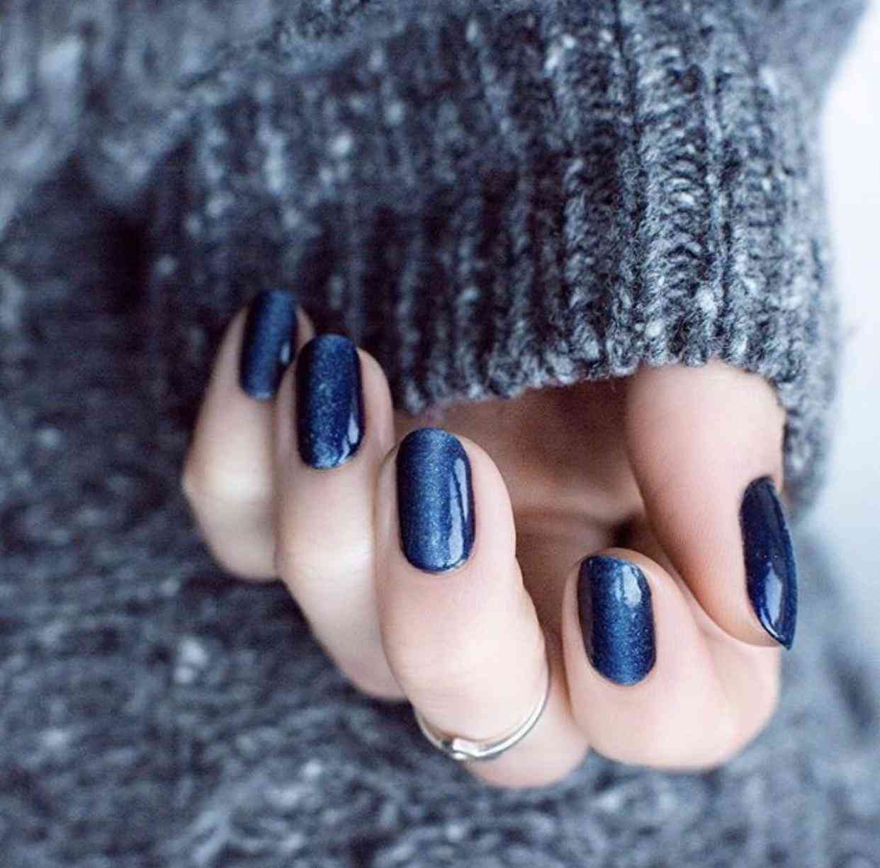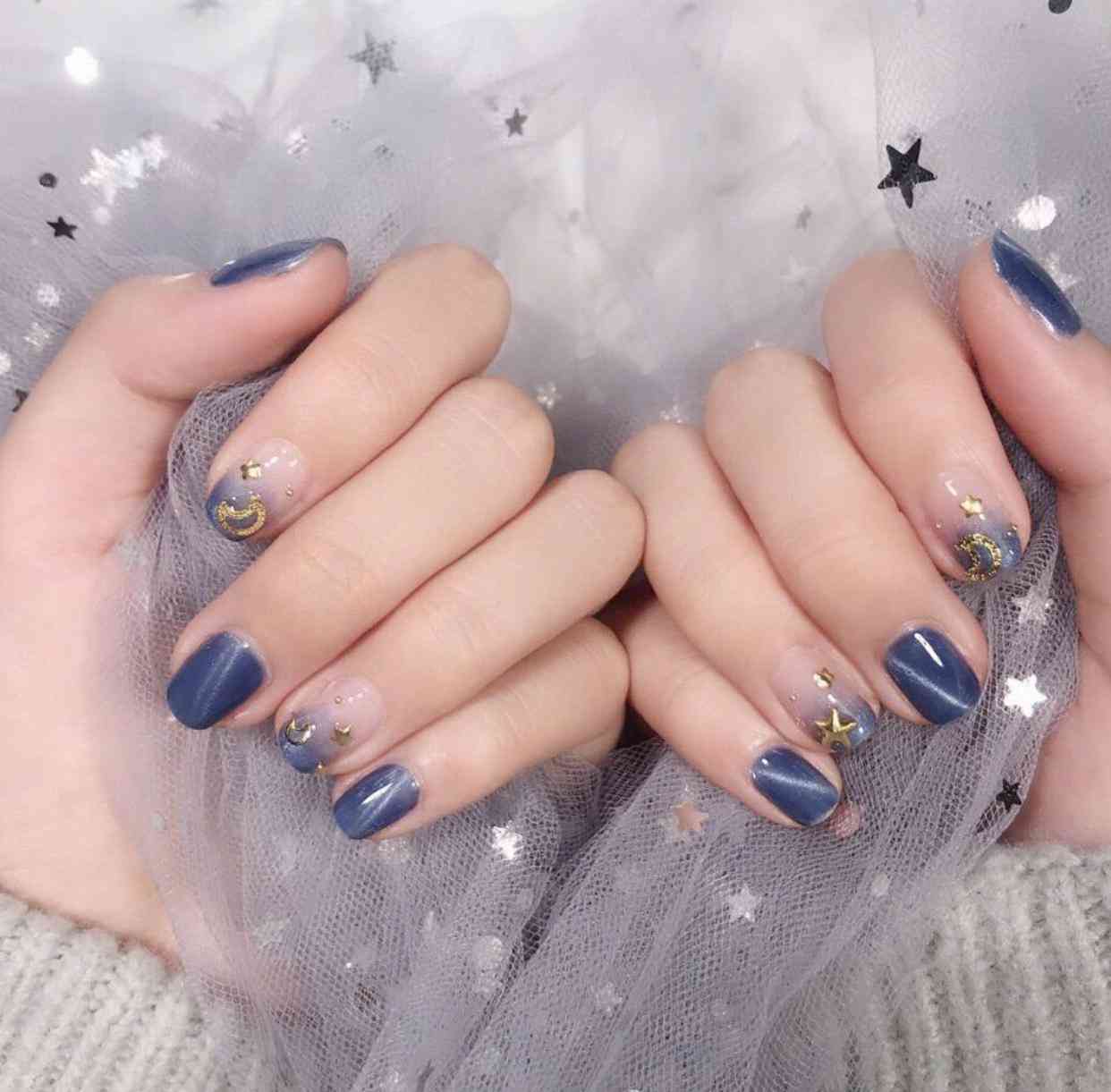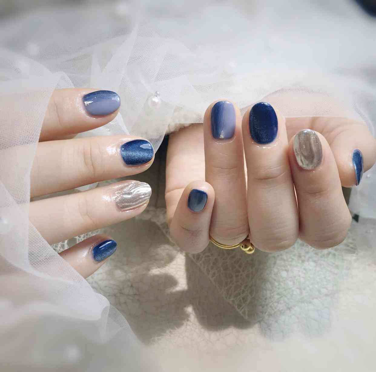 像这样的蓝色底色加上银色的发光颗粒,做出来的效果会显得更加温和一些,有着非常浪漫的气氛,搭配上晕染甲会非常漂亮,指尖看起来仙气十足哦!