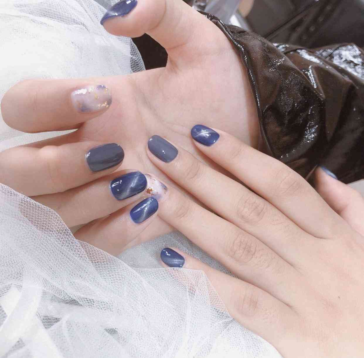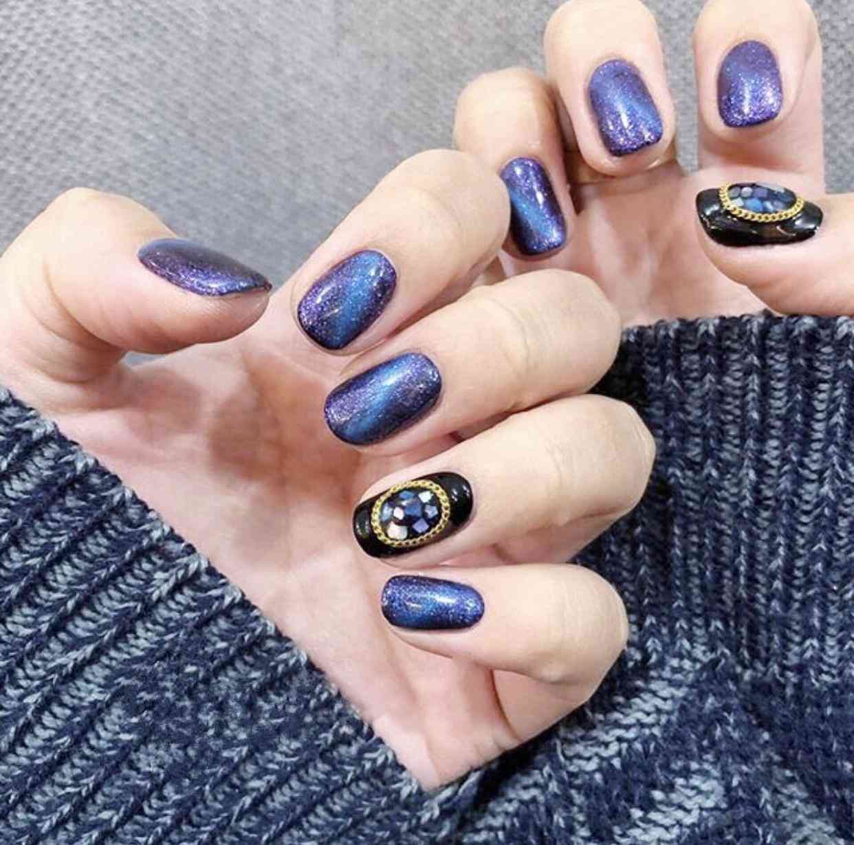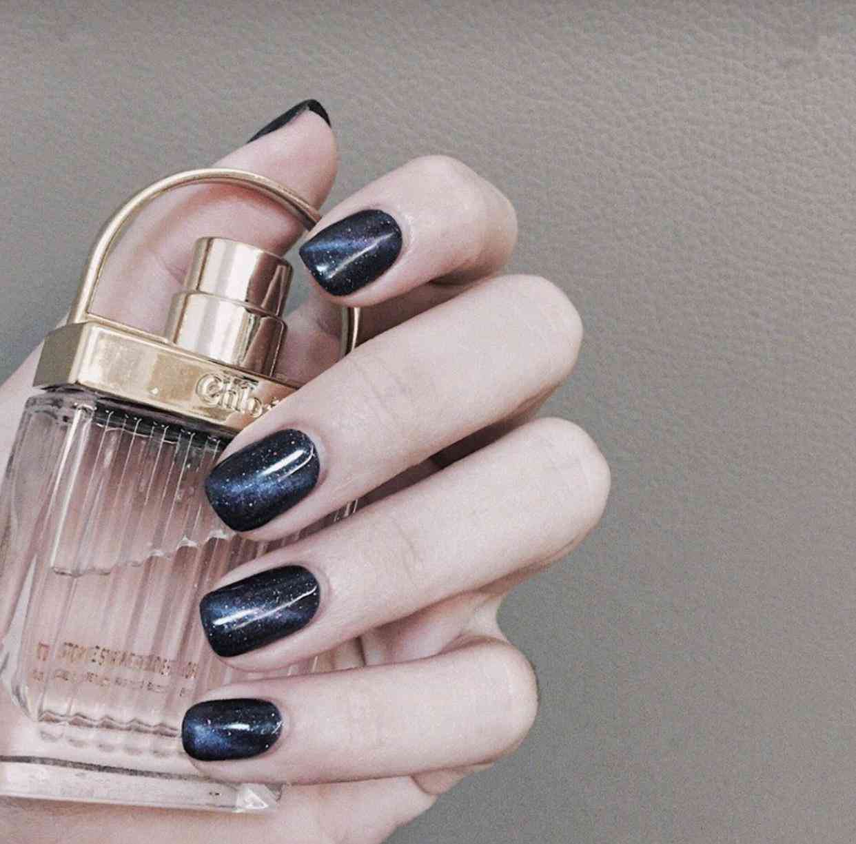 在黑色的甲面上加上裸透质感的蓝色猫眼胶,做出来的效果是非常漂亮的,就像在指尖画出了银河一样,非常梦幻,用来做成星空甲也是非常不错哦~