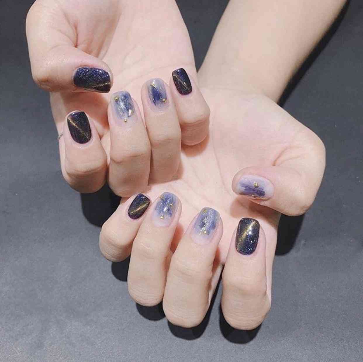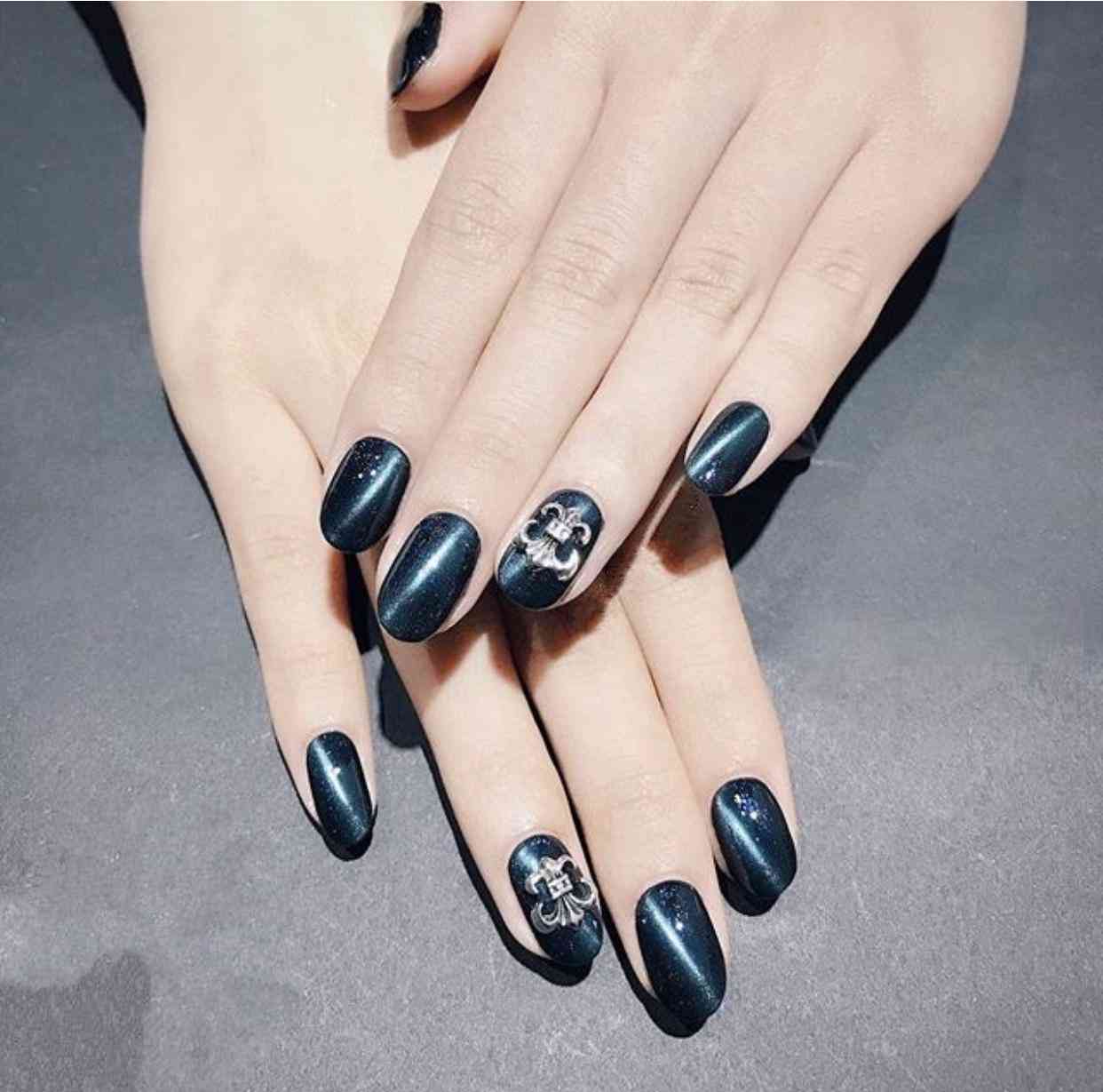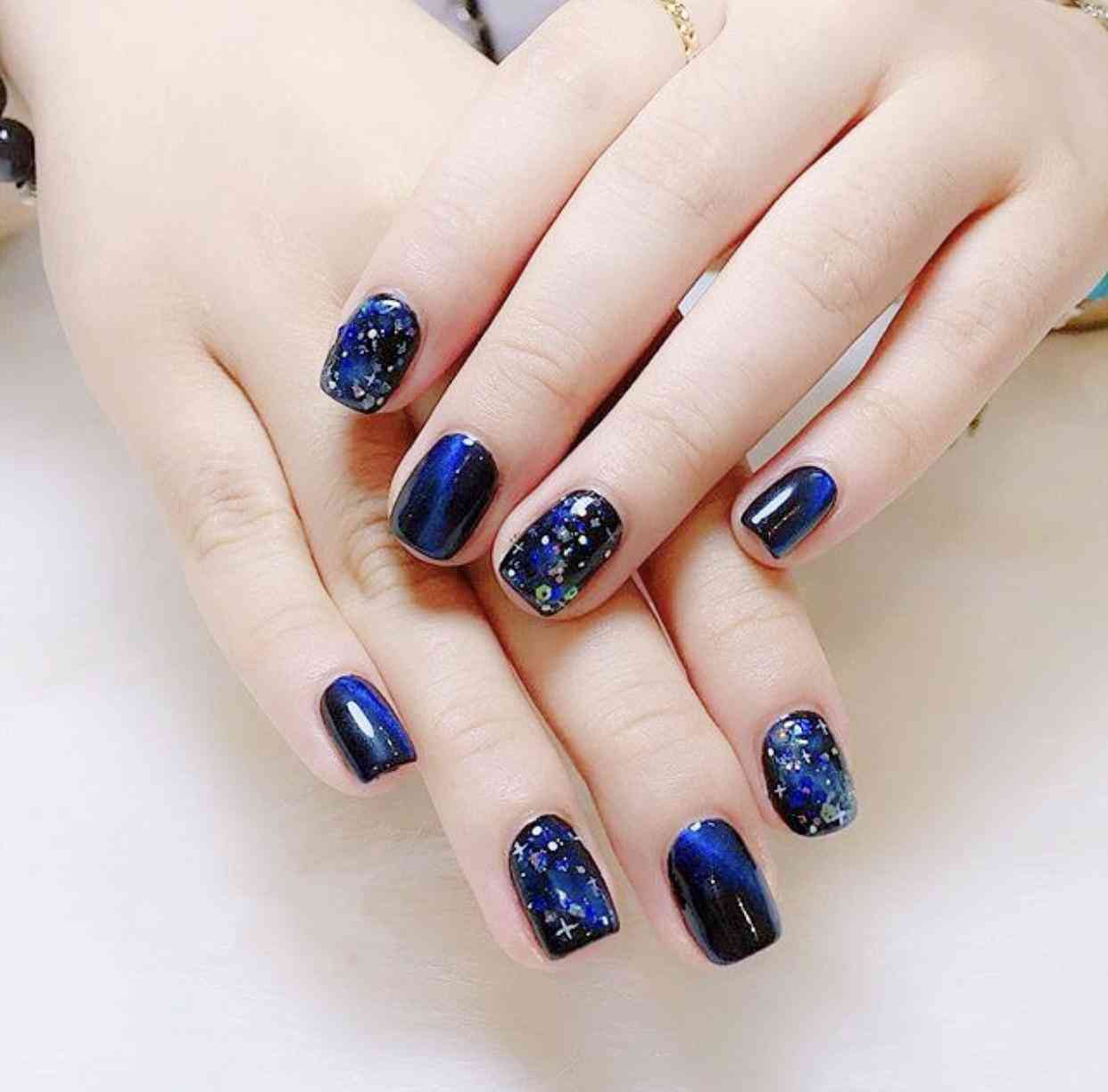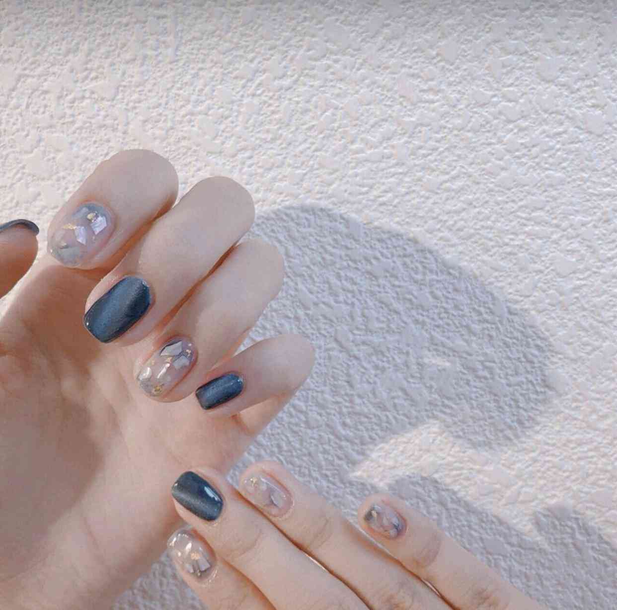 在黑色的甲面上加上裸透质感的蓝色猫眼胶,做出来的效果是非常漂亮的,就像在指尖画出了银河一样,非常梦幻,用来做成星空甲也是非常不错哦~