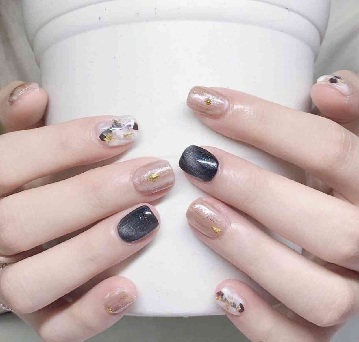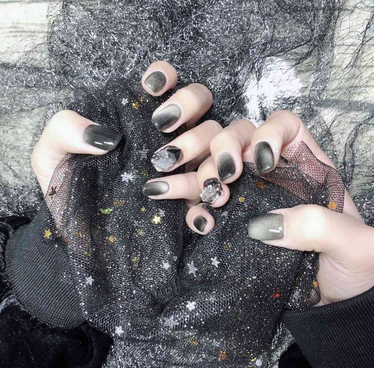 用黑色猫眼甲搭配一些浅色美甲,可以减少黑色的严肃感,让指尖显得更加活泼一下,对于很少做黑色美甲的女生来讲,这样的款式会更容易接受哦!